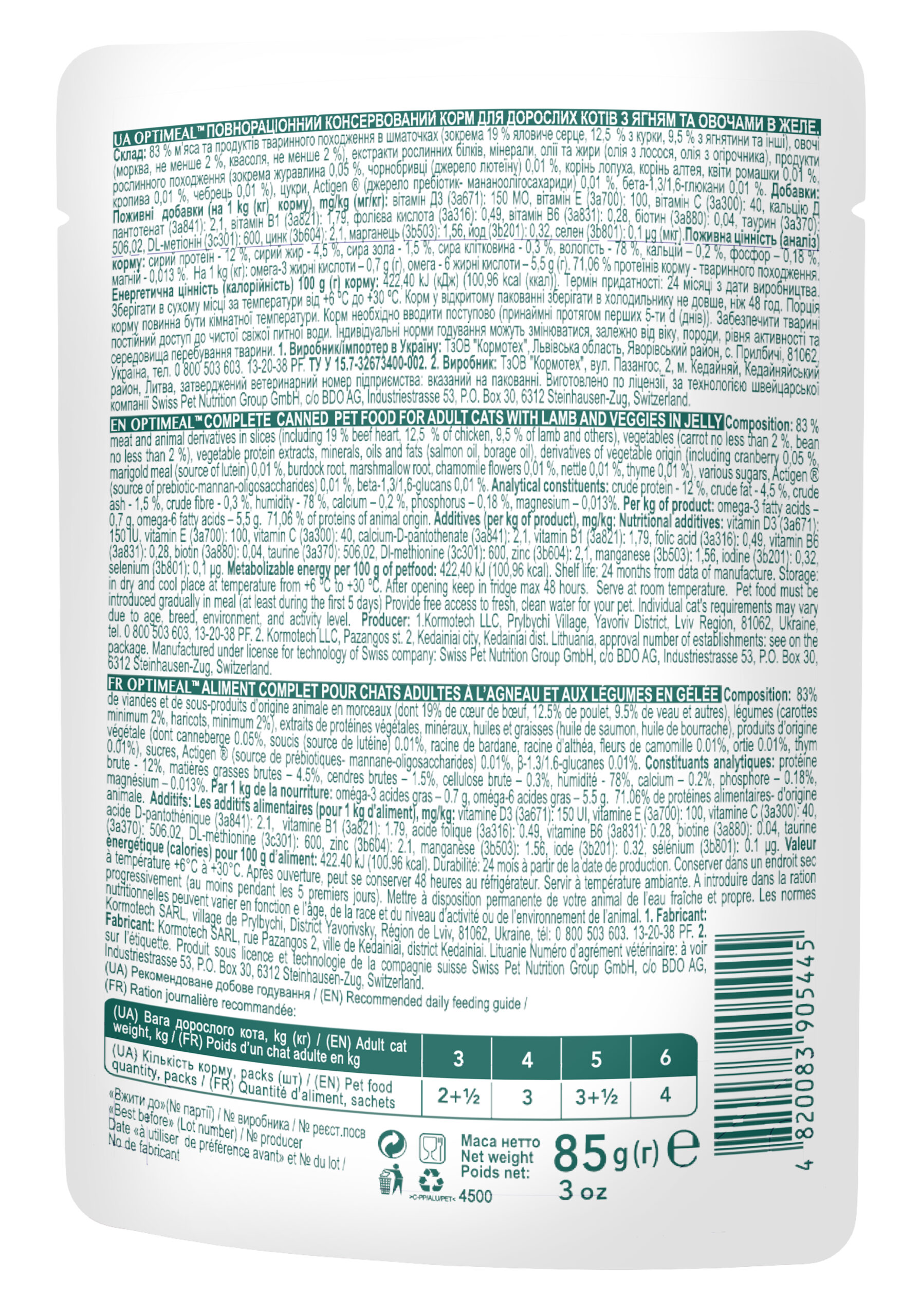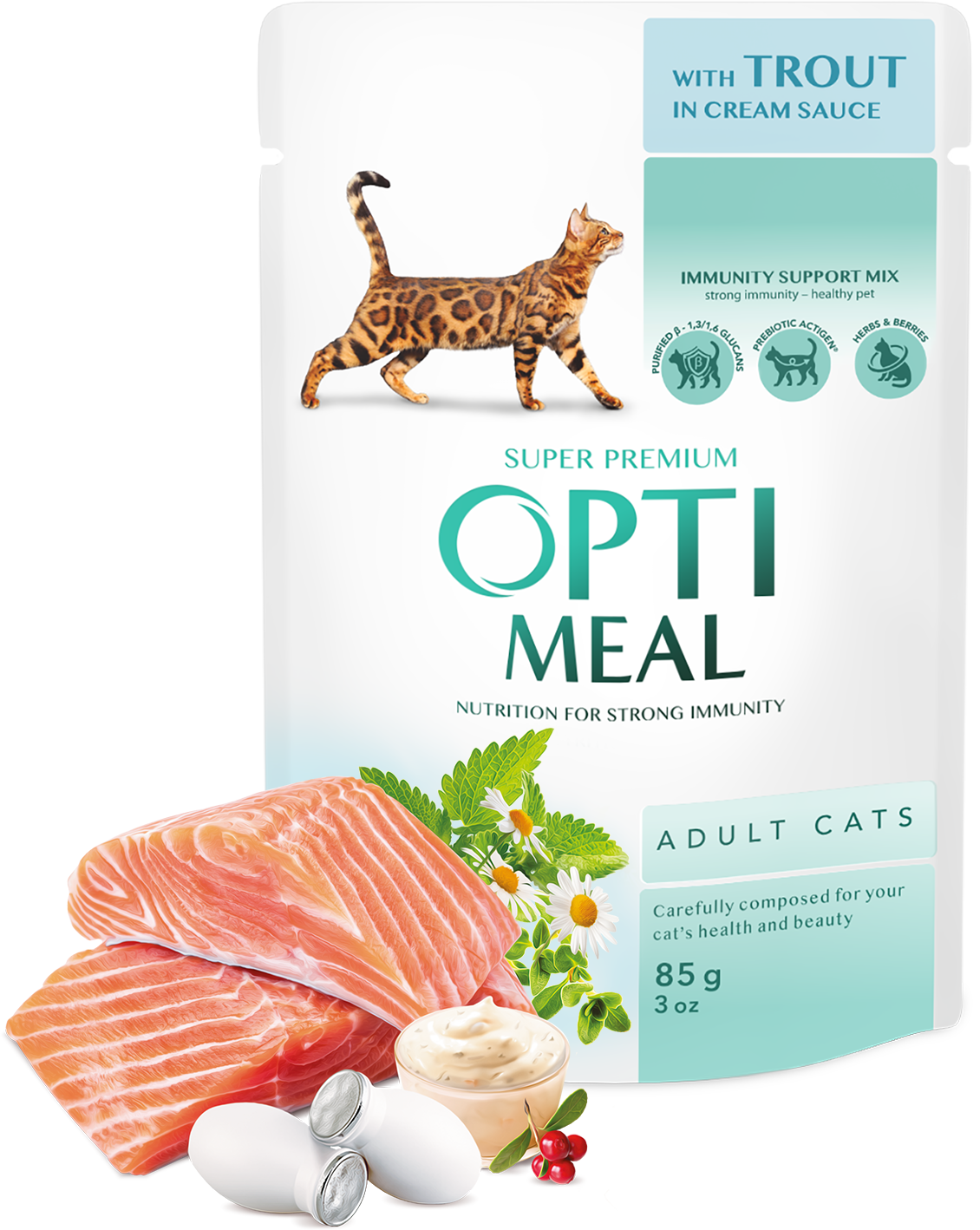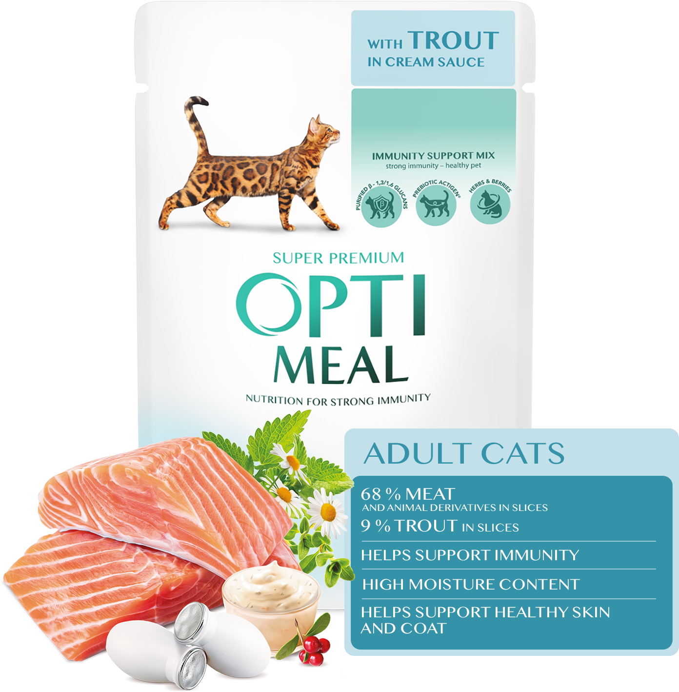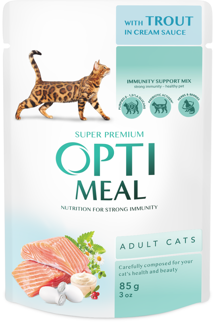 Optimeal Adult Cats – Trout in Cream Sauce is a complete and balanced wet food designed for adult cats. Crafted with high-quality trout and a smooth creamy sauce, this recipe delivers both taste and nutrition in every bite.