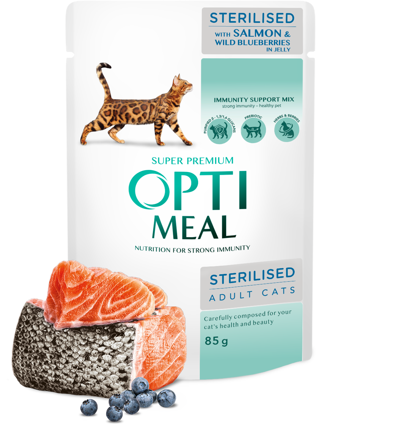 A super-premium wet food specially formulated for sterilised adult cats. Made with high-quality salmon and enriched with wild blueberries