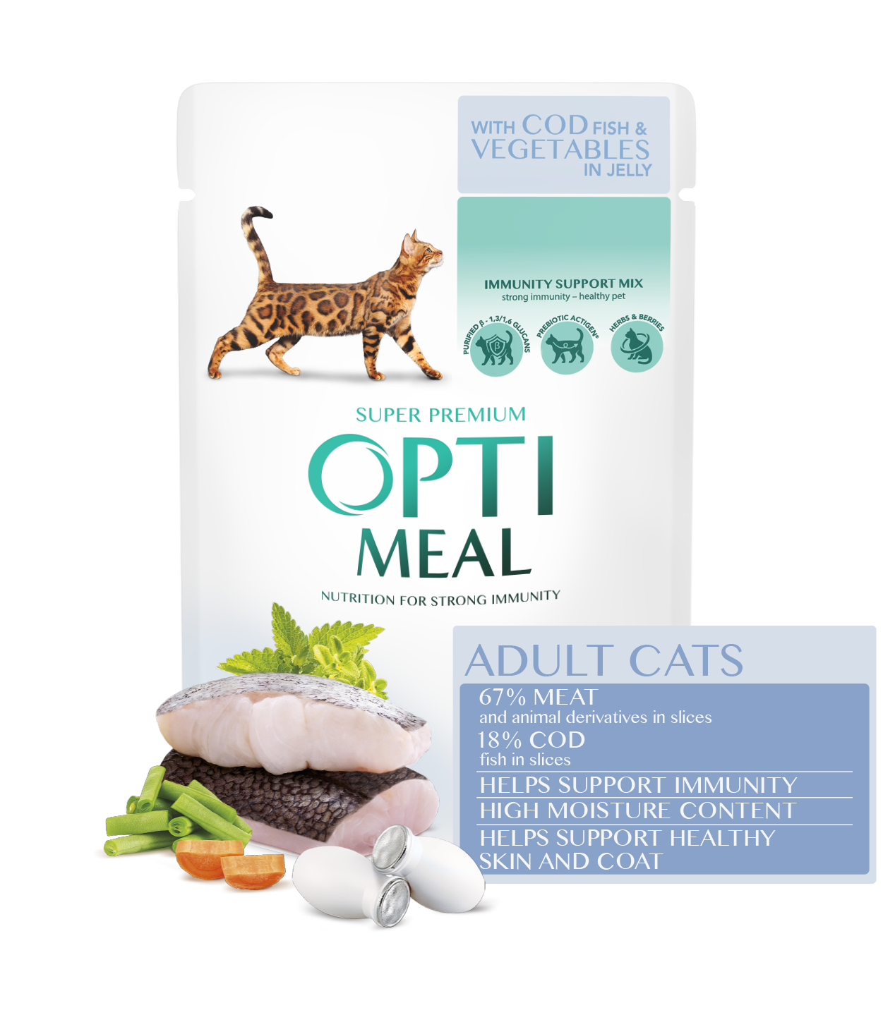 طعام رطب كامل للقطط البالغة بسمك القد والخضروات في الهلام. يدعم المناعة، صحة الجلد، والترطيب.