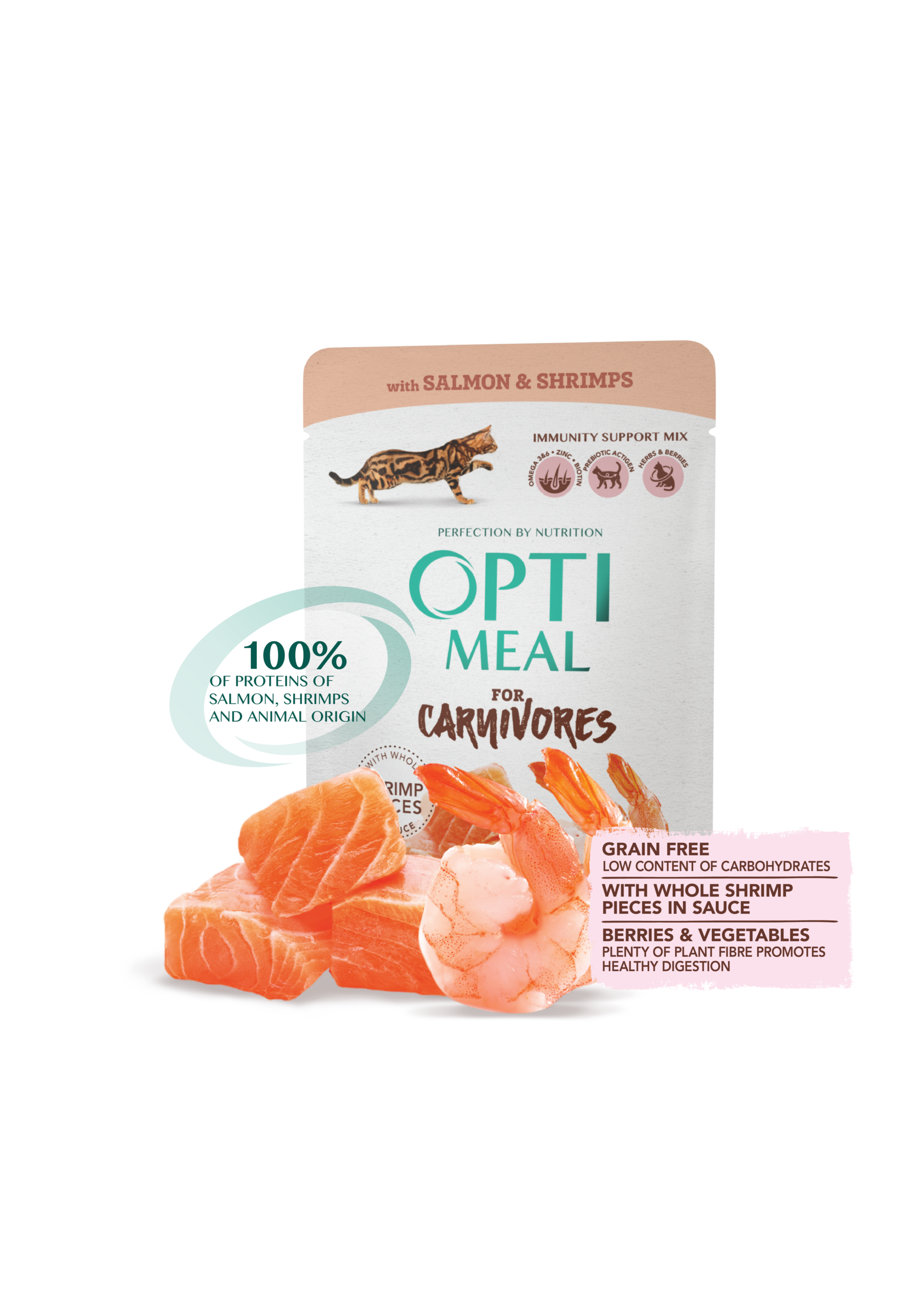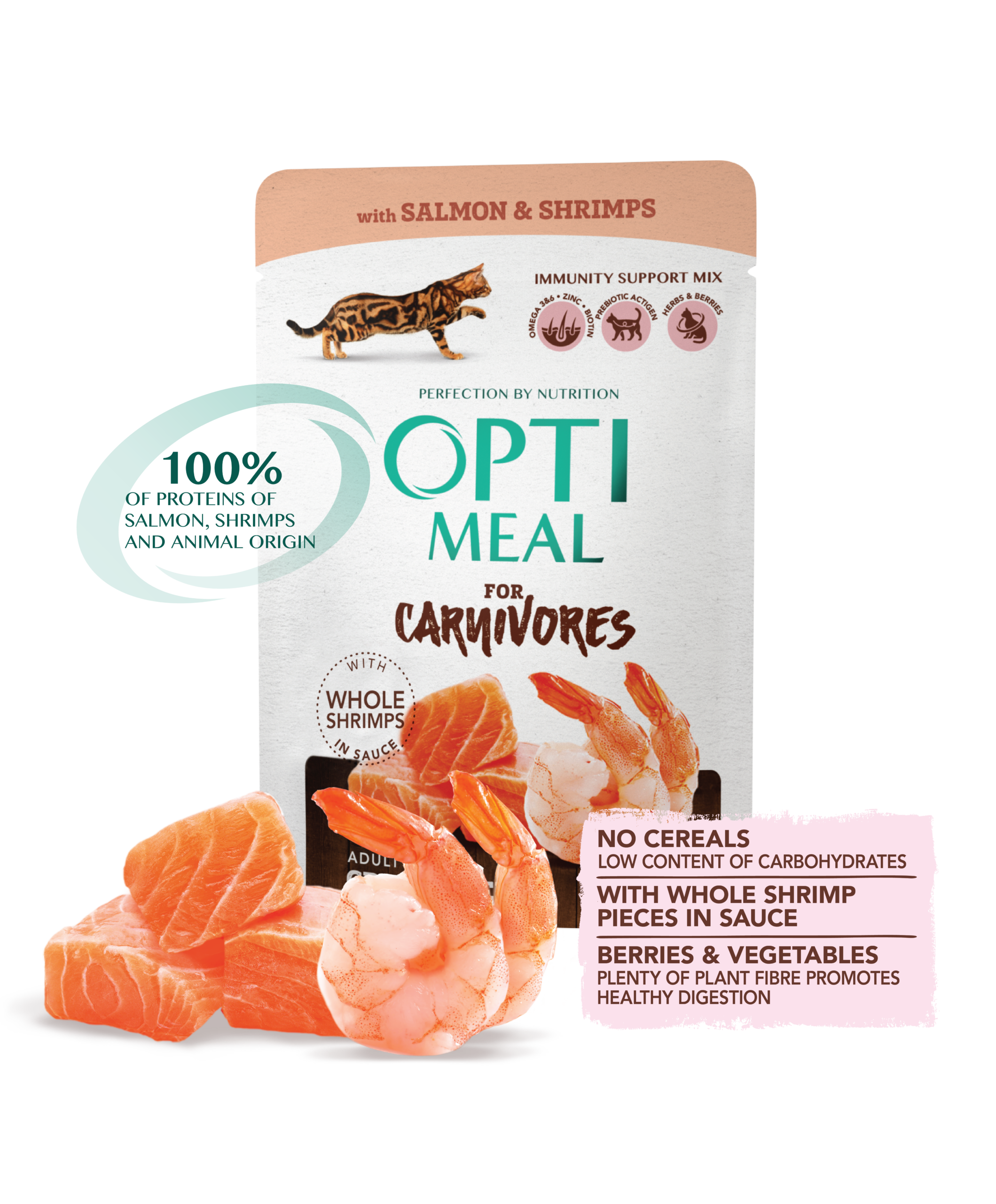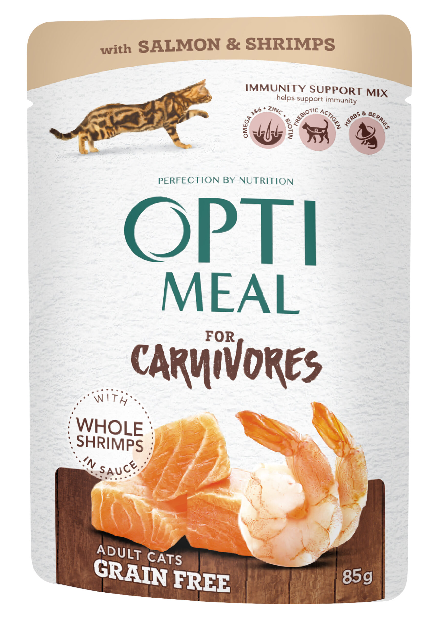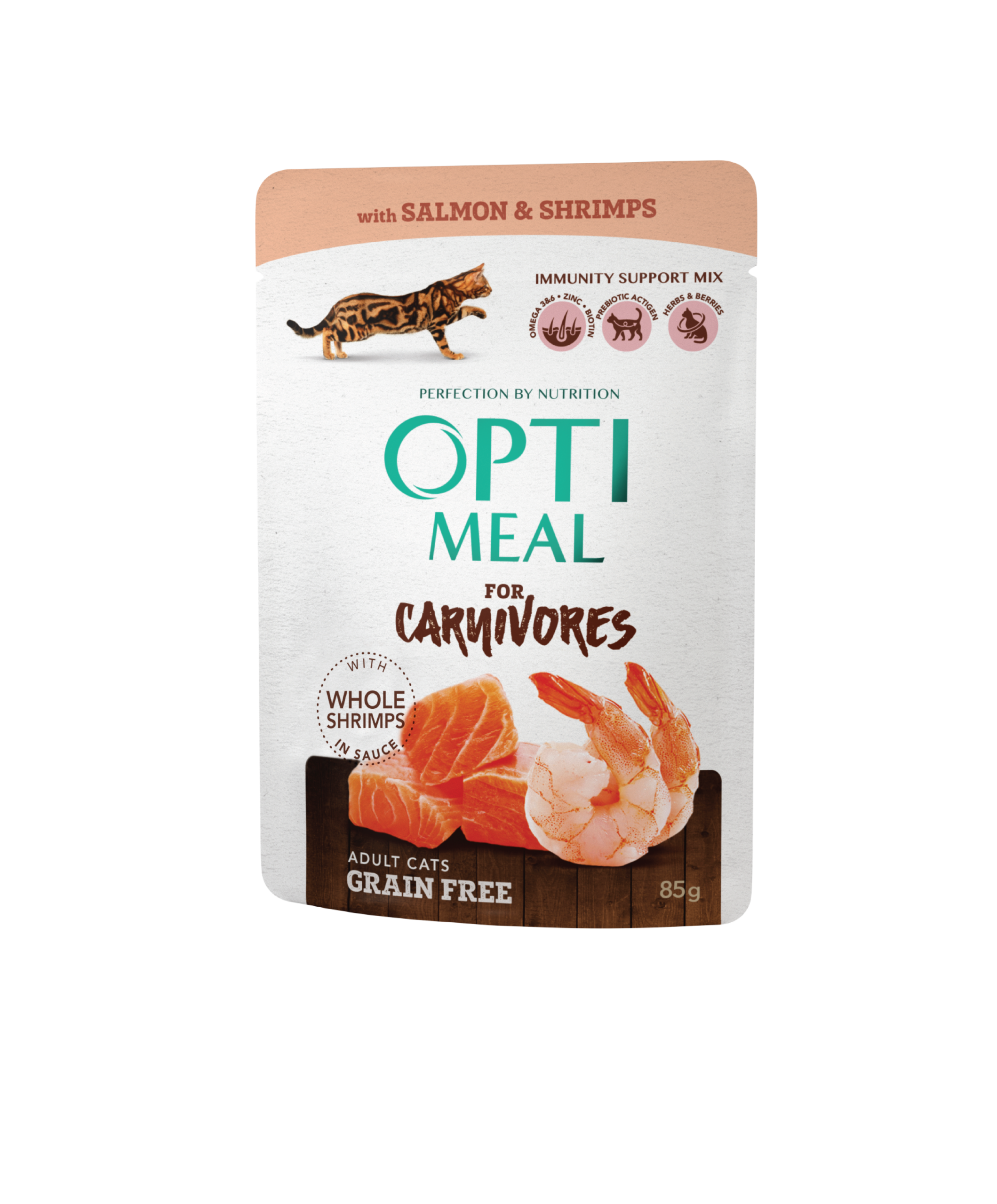طعام رطب كامل (خالٍ من الحبوب) للقطط البالغة بالسلمون وقطع الروبيان الكاملة في المرق. يدعم المناعة، الهضم، والحيوية العامة.
