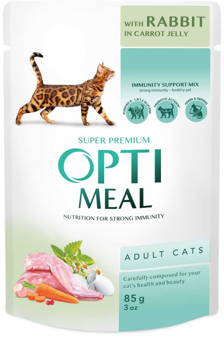 أوبتيمال سوبر بريميوم للقطط البالغة – لحم الأرانب في هلام الجزر (85 غرام).
