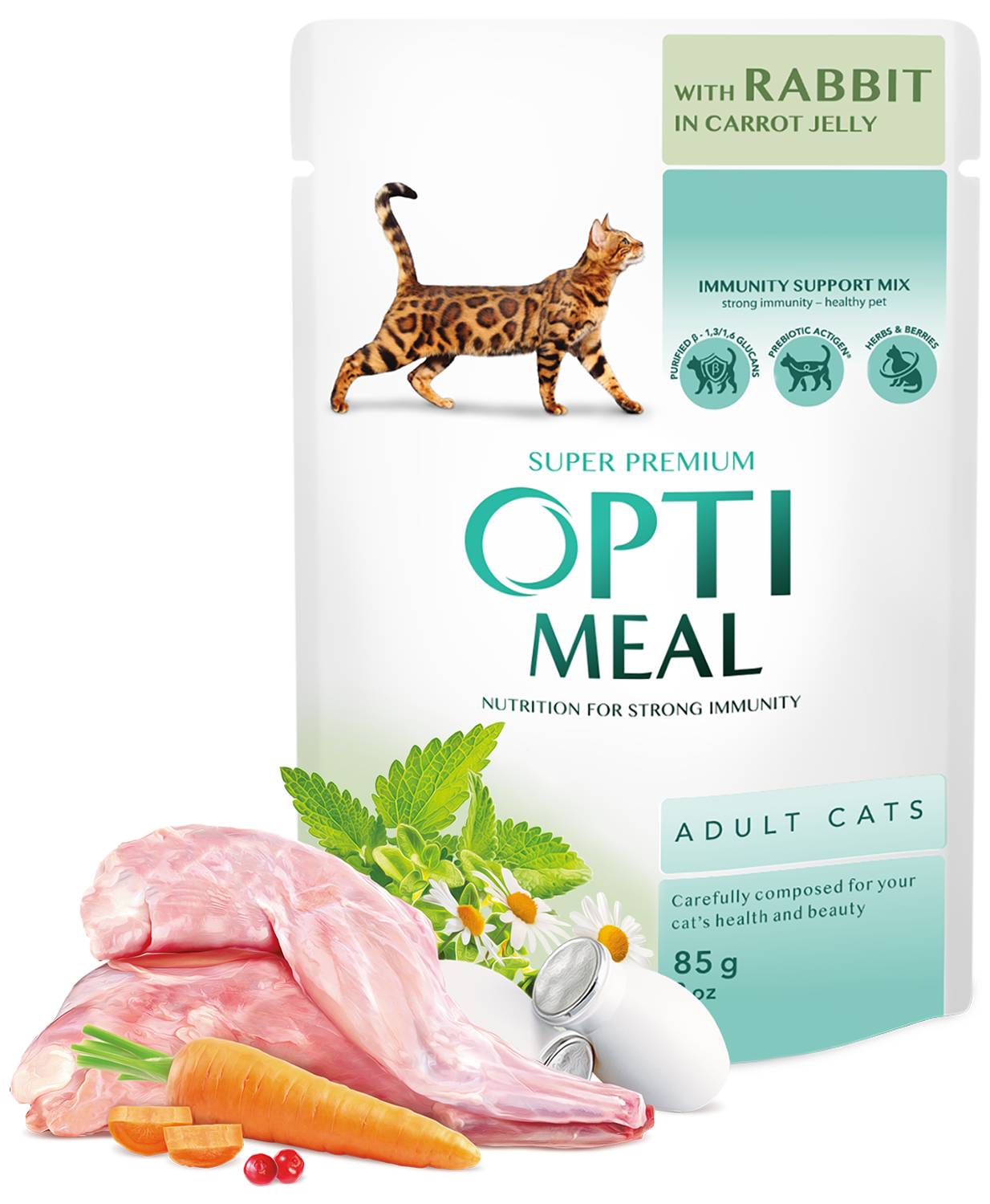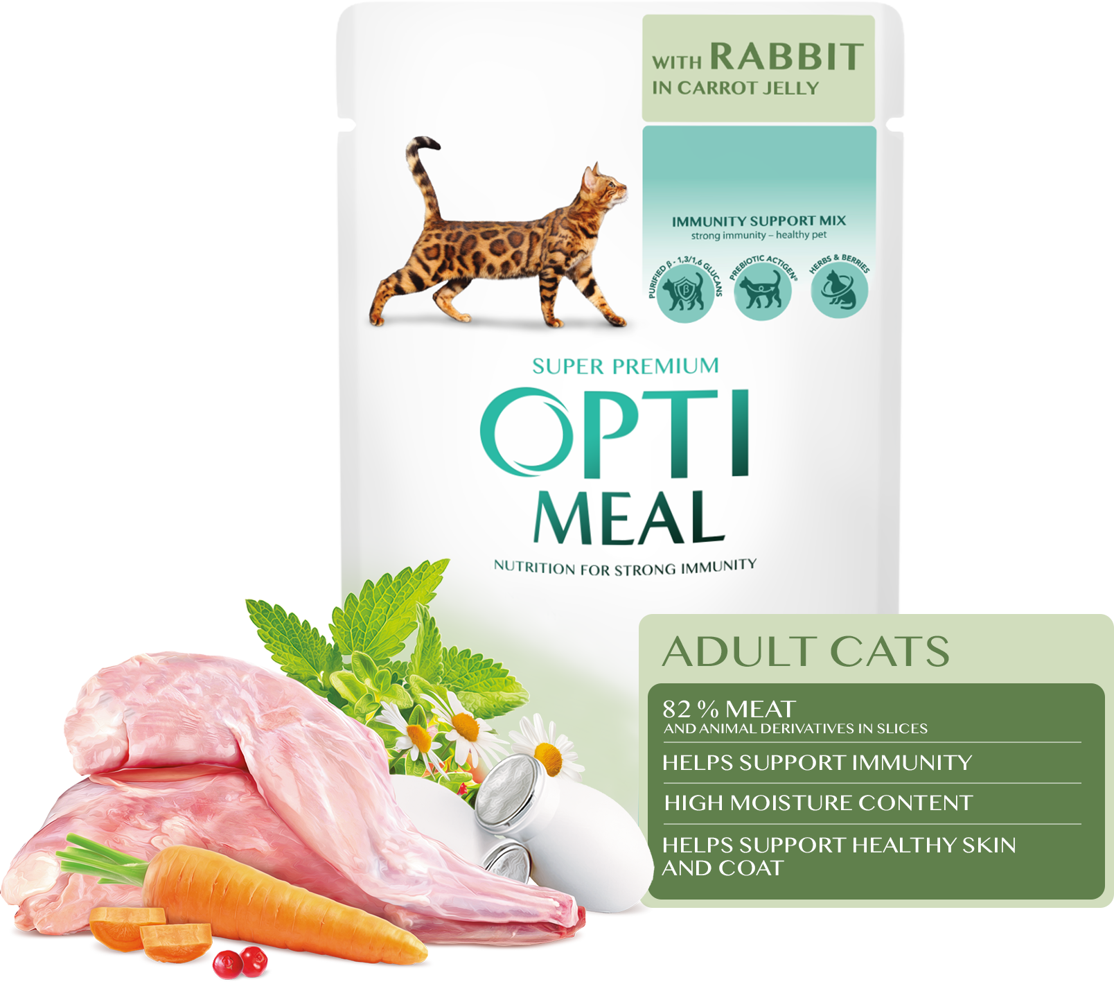 طعام رطب كامل ومتوازن للقطط البالغة بلحم الأرانب في هلام الجزر. يدعم المناعة، الترطيب، وصحة الجلد والفراء.