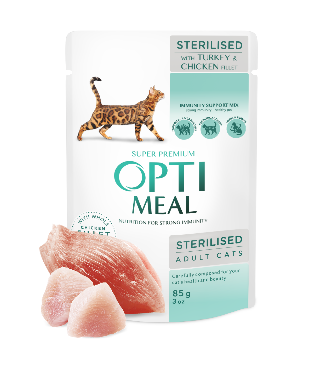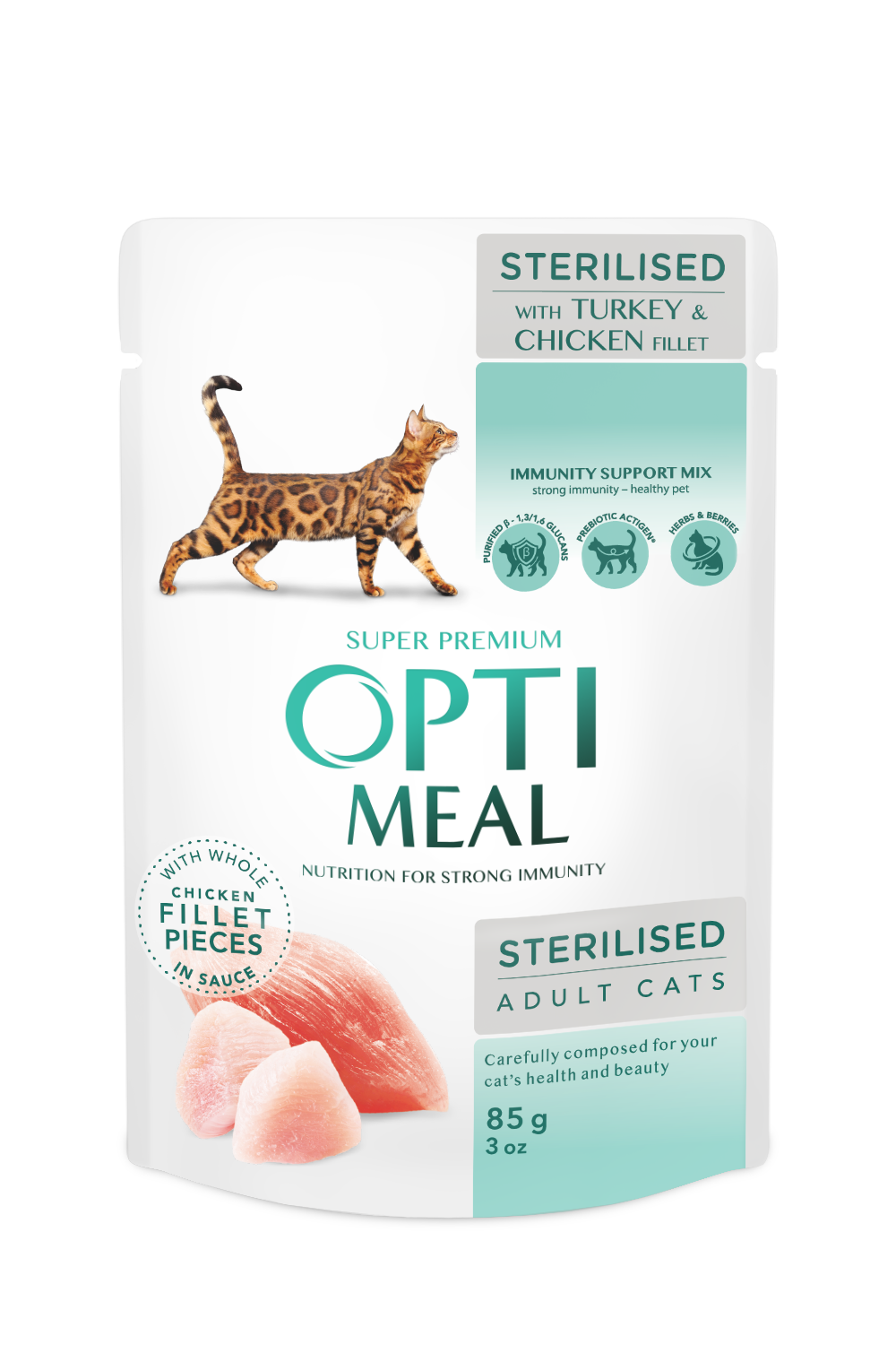 أوبتيمال سوبر بريميوم “الديك الرومي وفيليه الدجاج للقطط المعقمة” هو طعام رطب مصمم خصيصاً لتلبية الاحتياجات الغذائية للقطط البالغة بعد عملية التعقيم.